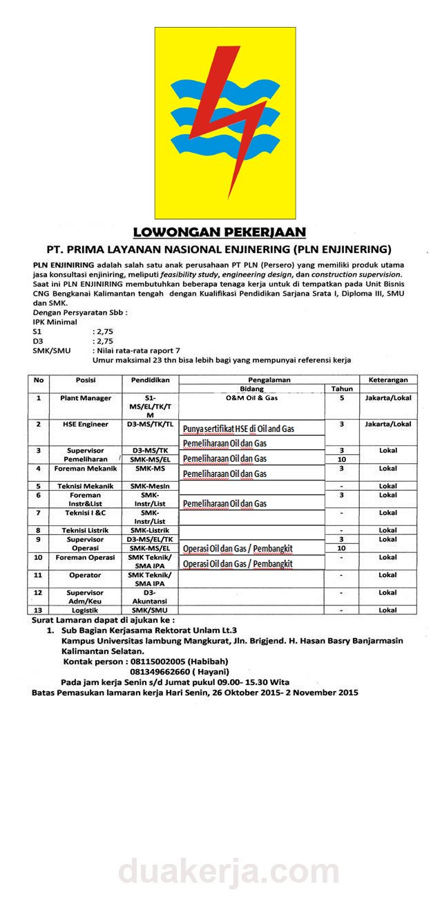 dipunyai. Saat ini Perusahaan Listrik Negara membuka lowongan kerja bumn terbaru 2015, Adapun